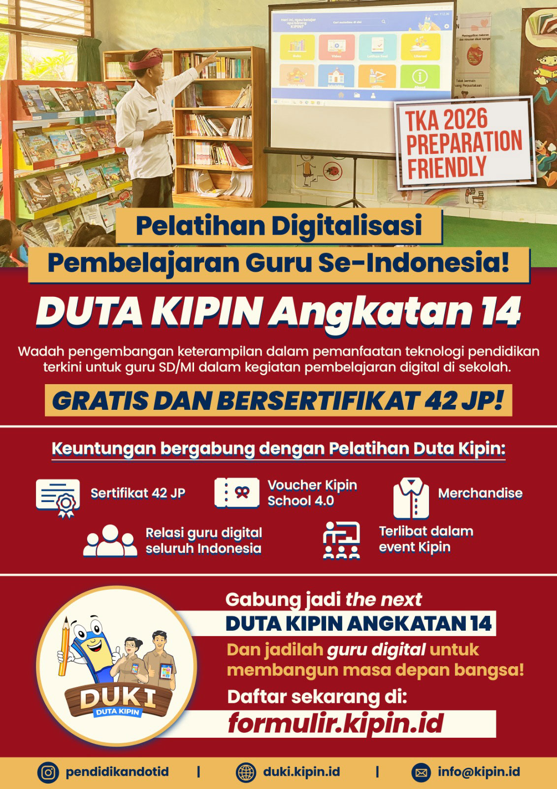 "Program pelatihan DUKI ini sangat bermanfaat bagi para guru-guru yg ingin berkembang mengikuti perkembangan zaman pada dunia pendidikan. Guru-guru tidak lagi ketinggalan dengan kemajuan peserta didik dalam pemanfaatan teknologi digital terutama pemanfaatannya dalam dunia pendidikan. Bersyukur saat ini KBM pada mapel yang saya ajar sudah serba digital berkat aplikasi Kipin School 4.0 dan Kipin PTO."